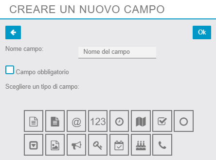 In questa schermata potremo dare il nome del campo, decidere se il campo richiesto è obbligatorio e scegliere il tipo di campo indicando l’apposita icona (testo, numero, numero di telefono, indirizzo email, data di nascita, ecc.).
